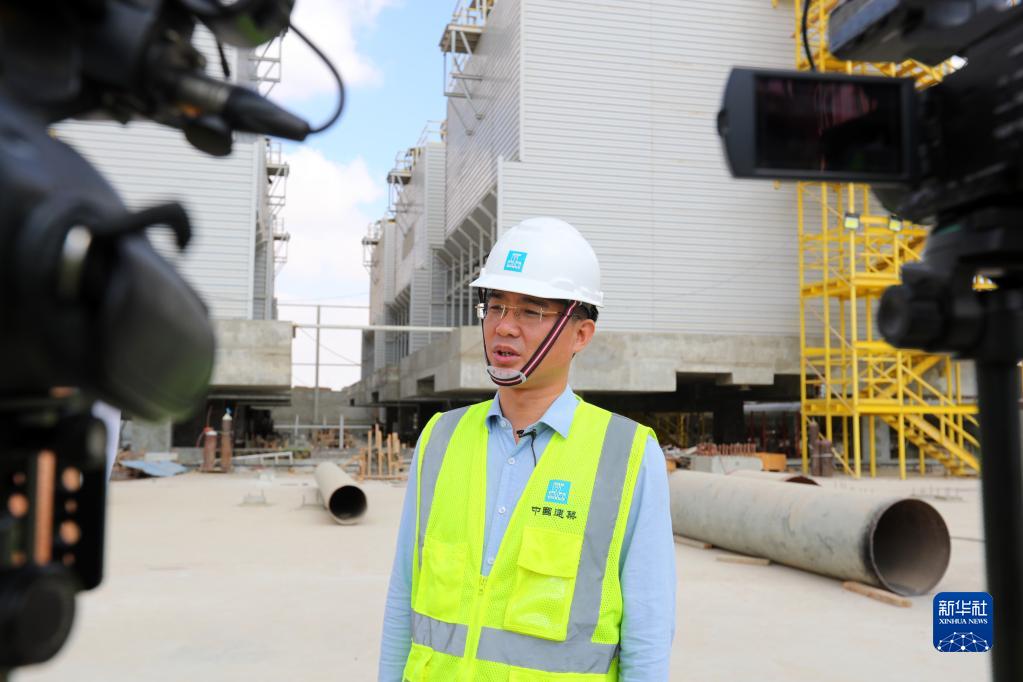 10月11日,在埃及新行政首都中央商務區項目建設現場,中建埃及設計總監袁浩介紹項目施工中的綠色實踐。新華社記者 隋先凱 攝