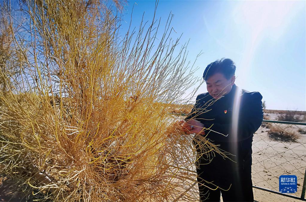 11月4日,內蒙古巴彥淖爾市烏拉特后旗巴音查干嘎查黨支部書記寶玉查看梭梭長勢。