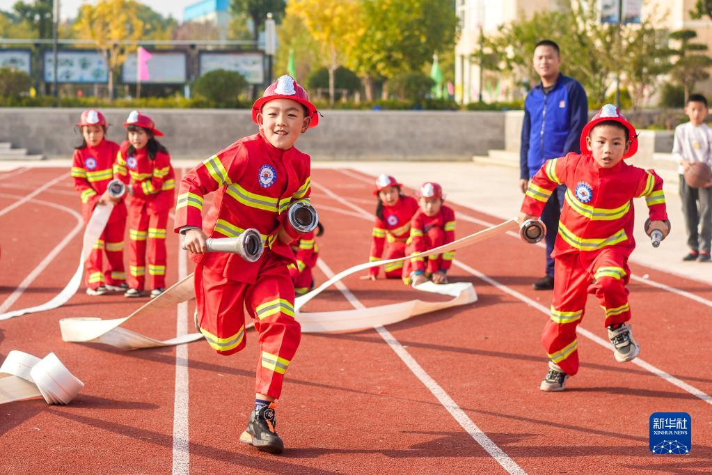 11月9日,在浙江省長興縣煤山鎮(zhèn)中心小學(xué),學(xué)生在體驗(yàn)消防員體能訓(xùn)練。