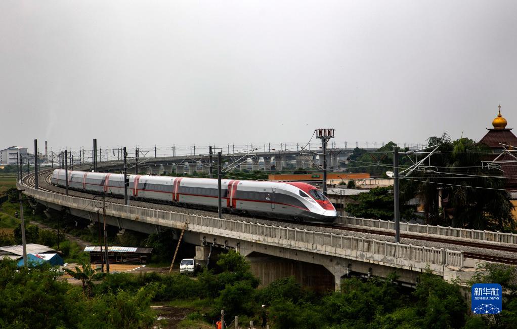 11月9日,在印度尼西亞西爪哇省萬隆市,一列高鐵動車組正在雅萬高鐵試驗段進行熱滑試驗。