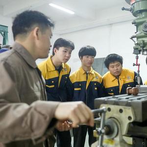 11月9日,華鎣市一家光電儀器企業技師在車間內給職業教育培訓中心的學生現場講解機床的操作技術。