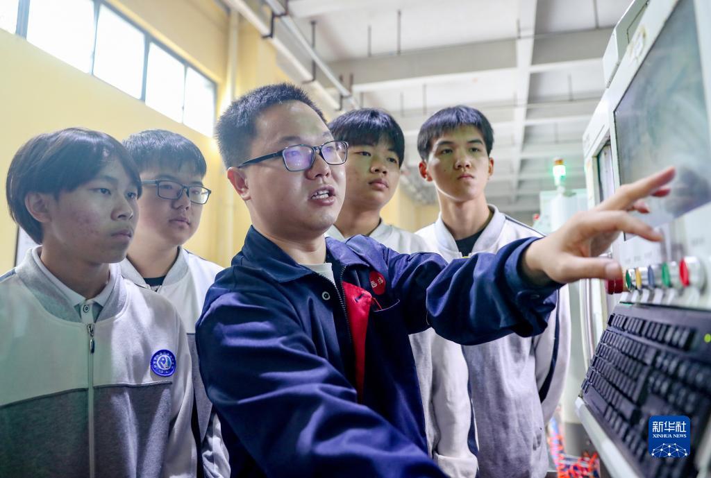 11月9日,華鎣市一家電子產品企業技師在給職業教育培訓中心的學生講解生產設備操作技術。