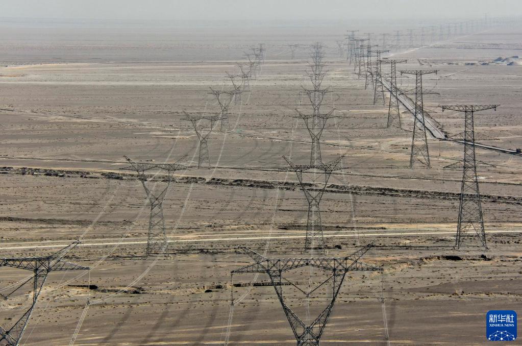 這是11月9日拍攝的新疆哈密至甘肅敦煌750千伏輸電線路(無人機照片)。