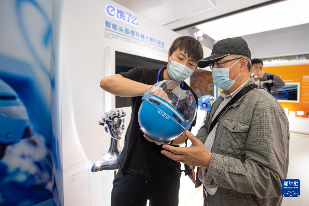 11月10日,阿里巴巴公司展臺的工作人員向觀眾講解智能頭盔的工作原理。