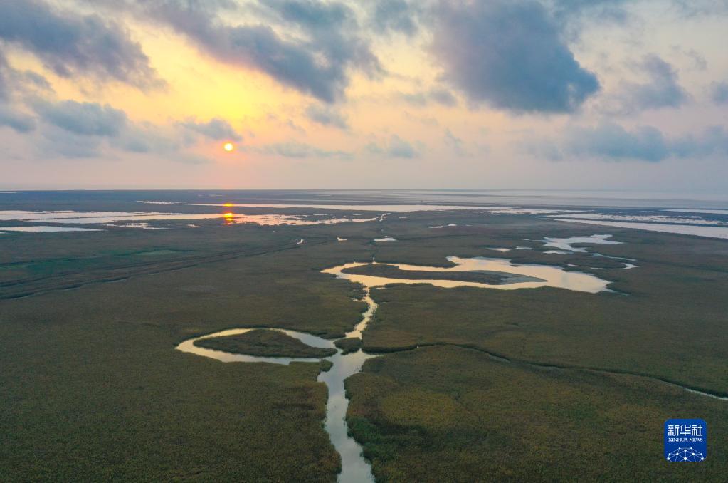 鹽城濕地珍禽國家級自然保護區日出景色(11月8日攝,無人機照片)。