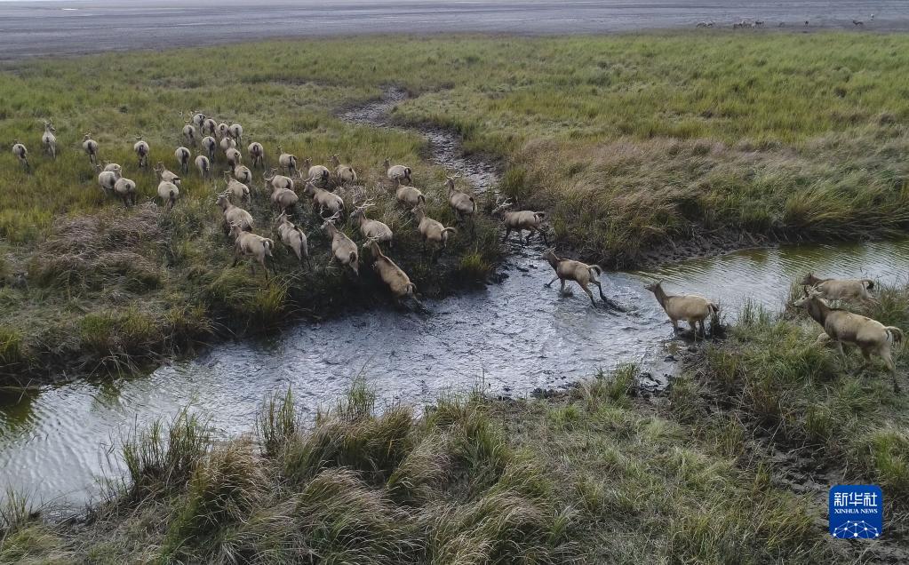 在江蘇大豐麋鹿國家級(jí)自然保護(hù)區(qū)拍攝的麋鹿(2017年11月14日攝,無人機(jī)照片)。