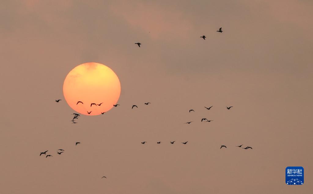 鹽城濕地珍禽國家級自然保護區日出景色(11月8日攝)。