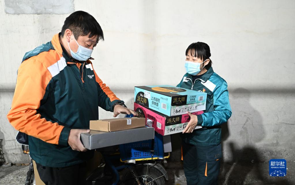 11月7日,在中國郵政集團有限公司天津市和平區分公司貴州路速遞營業部,劉婷(右)與同事接收新攬收快件。