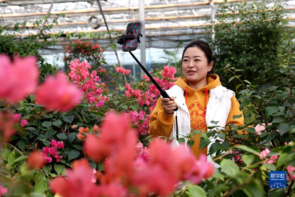 11月9日,網絡主播在山東省濱州市惠民縣麻店鎮的一家花卉種植基地直播銷售花卉。