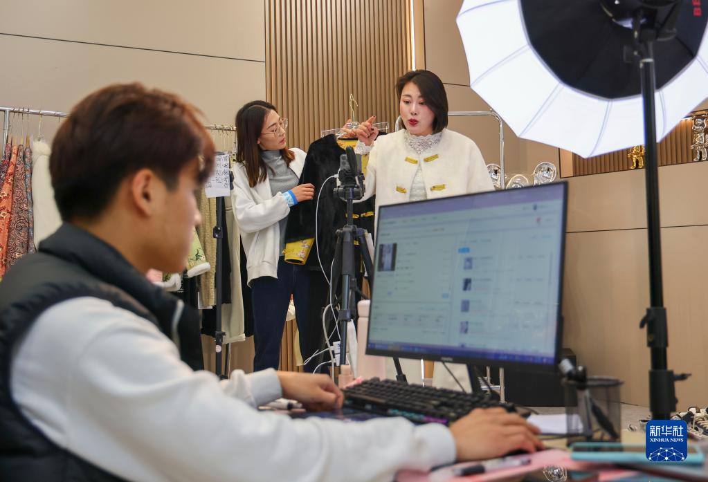 11月9日,在山東省臨沂市臨谷電商產業園,一家電商企業的直播團隊在直播賣貨。