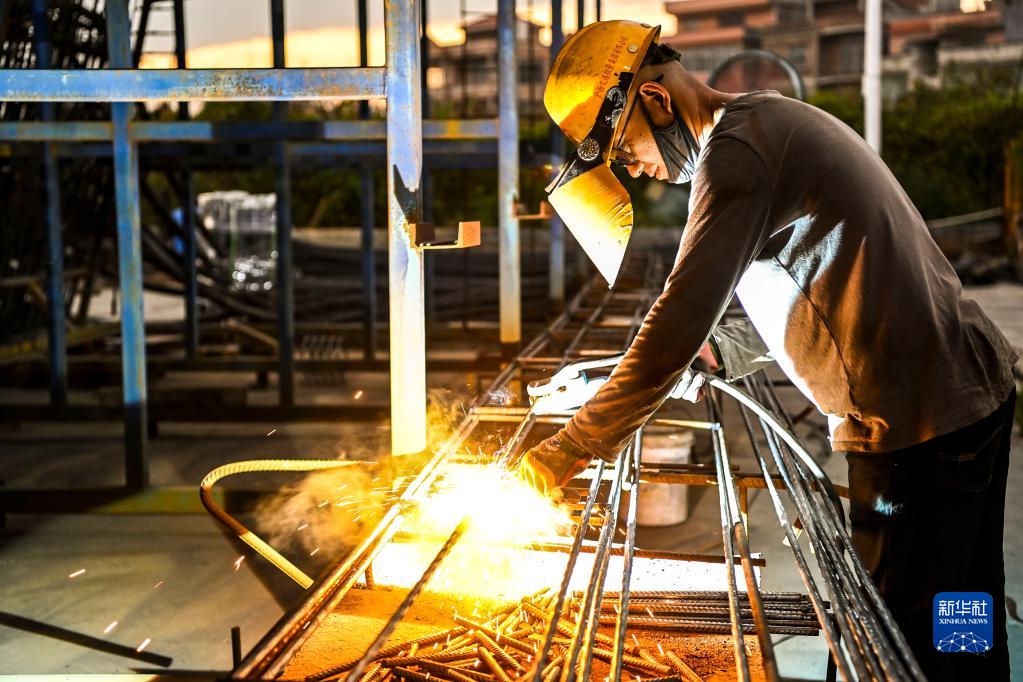 11月10日,在南玉鐵路站前工程7標段附近一處制梁場,工作人員在焊接鋼筋構件。