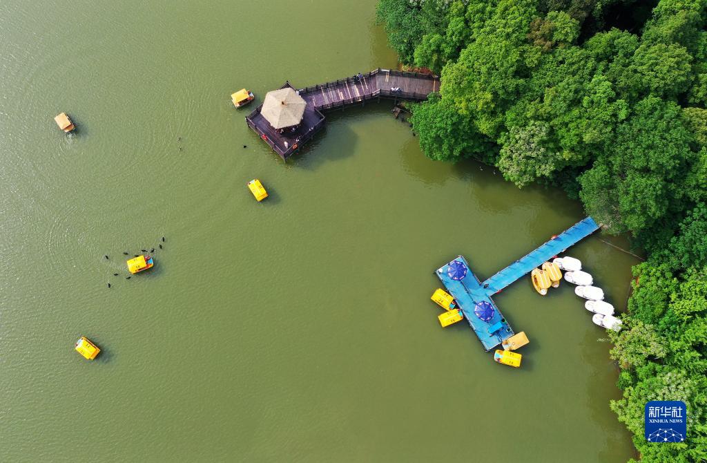 南昌市高新區艾溪湖濕地公園,市民在湖中游玩(2021年5月2日攝,無人機照片)。