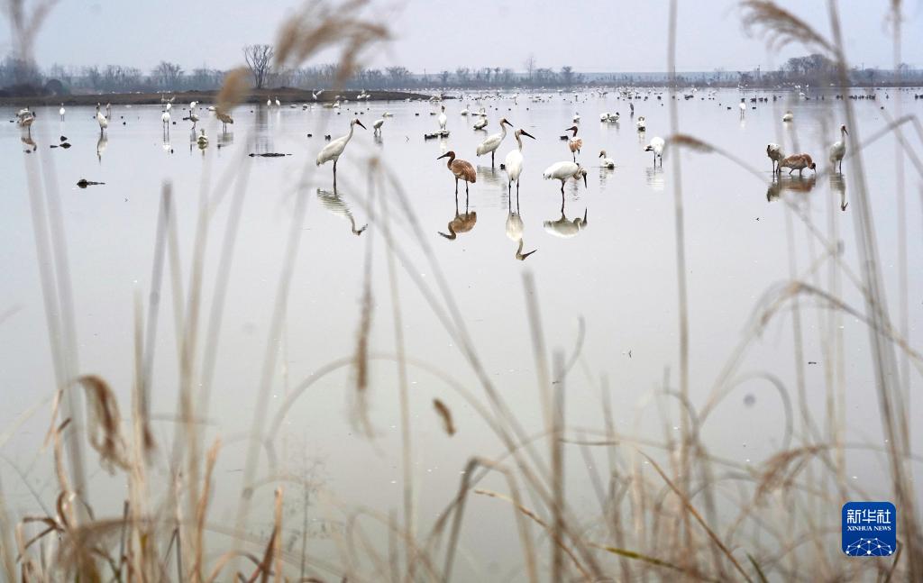 在南昌市高新區(qū)五星白鶴保護小區(qū),白鶴、天鵝等候鳥在濕地中棲息覓食(1月12日攝)。