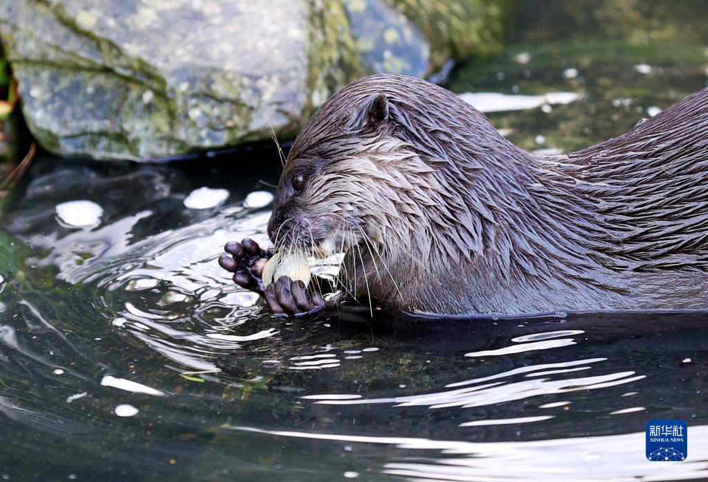 一只水獺在英國倫敦濕地中心享受美食(11月9日攝)。