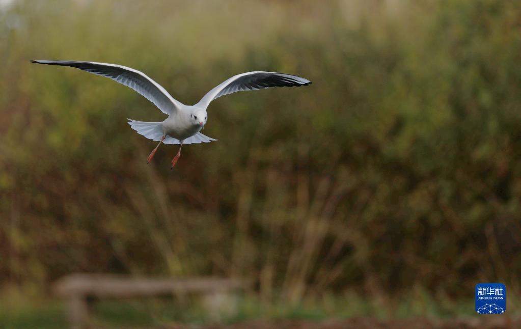 一只紅嘴鷗在英國倫敦濕地中心展翅飛翔(11月9日攝)。