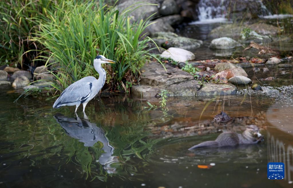 這是11月9日在英國(guó)倫敦濕地中心拍攝的蒼鷺和水獺。