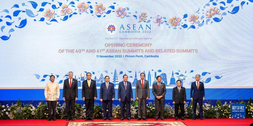 11月11日,在柬埔寨首都金邊,東盟國家領(lǐng)導(dǎo)人在第40屆和第41屆東盟峰會開幕式上合影。