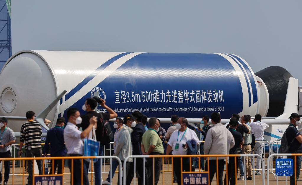 直徑3.5米、500噸推力先進(jìn)整體式固體發(fā)動(dòng)機(jī)亮相中國(guó)航展(11月9日攝)。