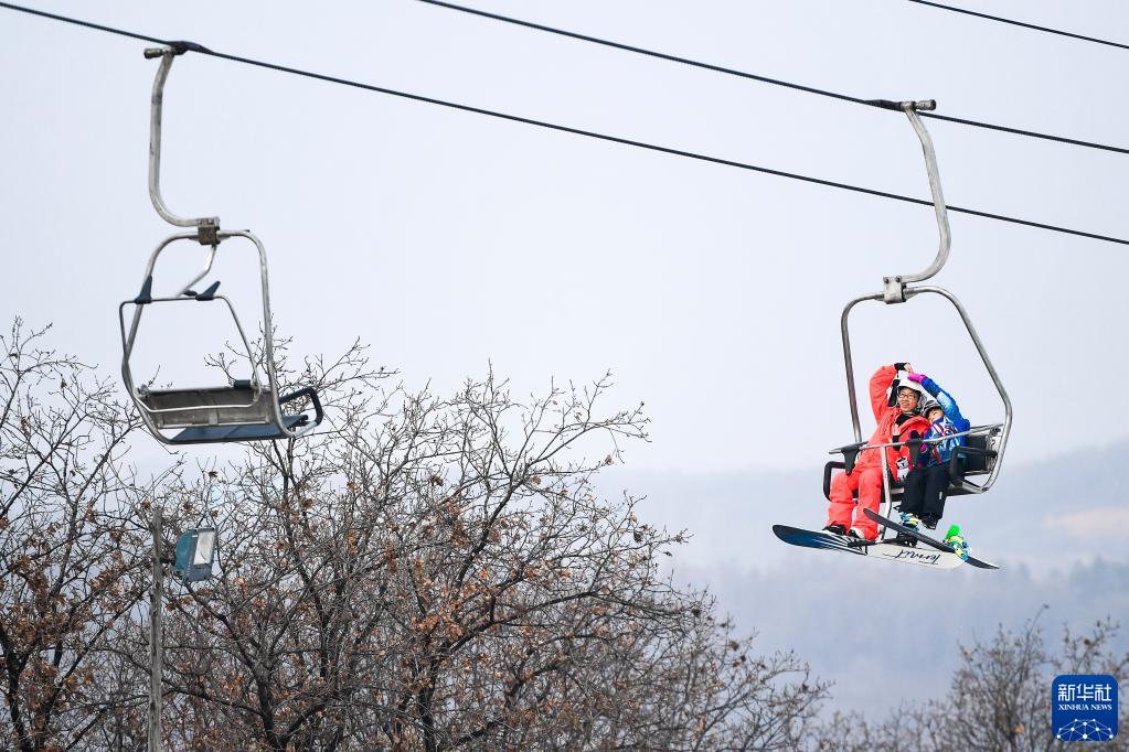 11月11日,滑雪愛好者乘坐廟香山滑雪場纜車。