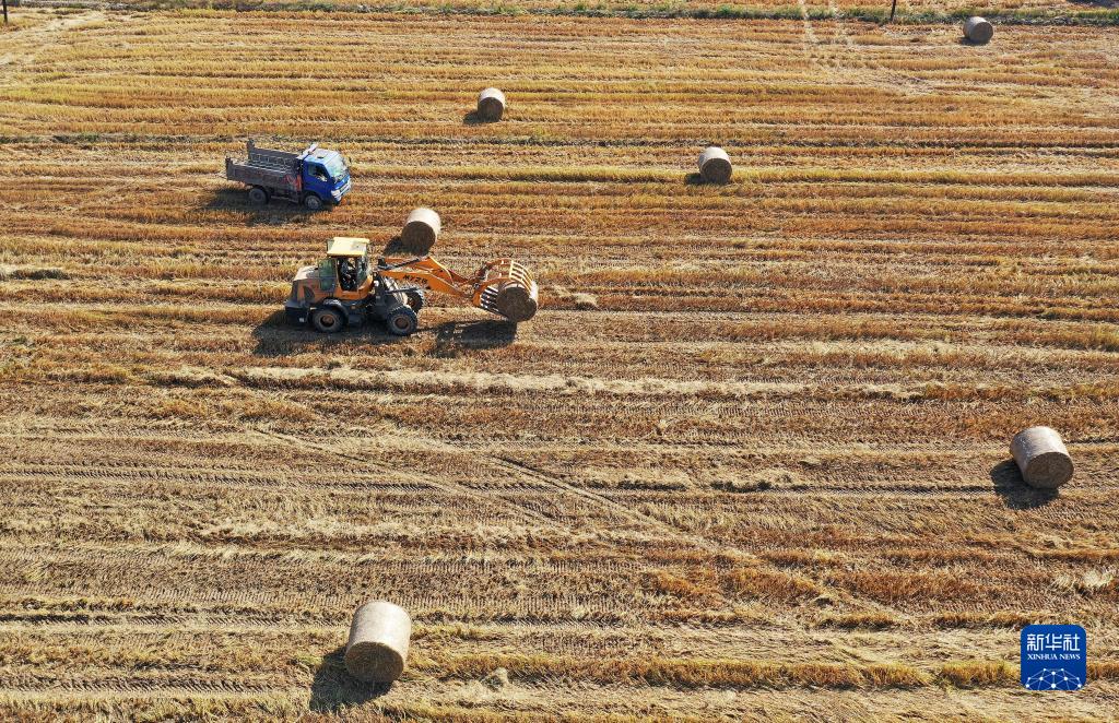 在南昌縣廣福鎮(zhèn),農(nóng)民在回收稻田里的秸稈(11月10日攝,無人機(jī)照片)。