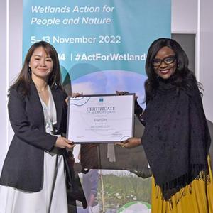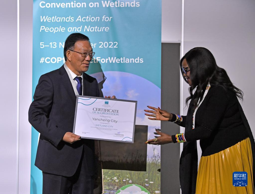 11月10日,在瑞士日內瓦,《濕地公約》秘書長蒙巴(右)為中國江蘇鹽城頒發“國際濕地城市”認證證書。