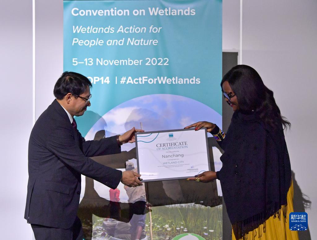 11月10日,在瑞士日內瓦,《濕地公約》秘書長蒙巴(右)為中國江西南昌頒發“國際濕地城市”認證證書。