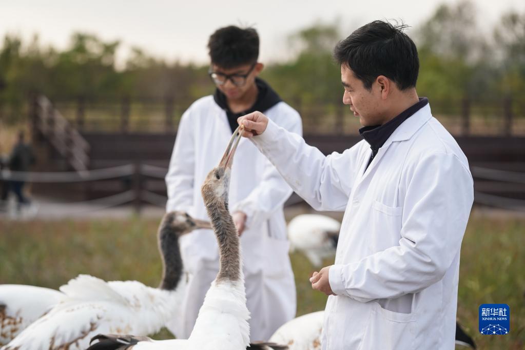 保護區(qū)馴養(yǎng)員姜官宏(右)和蔡新杰與人工繁育的丹頂鶴互動(11月8日攝)。