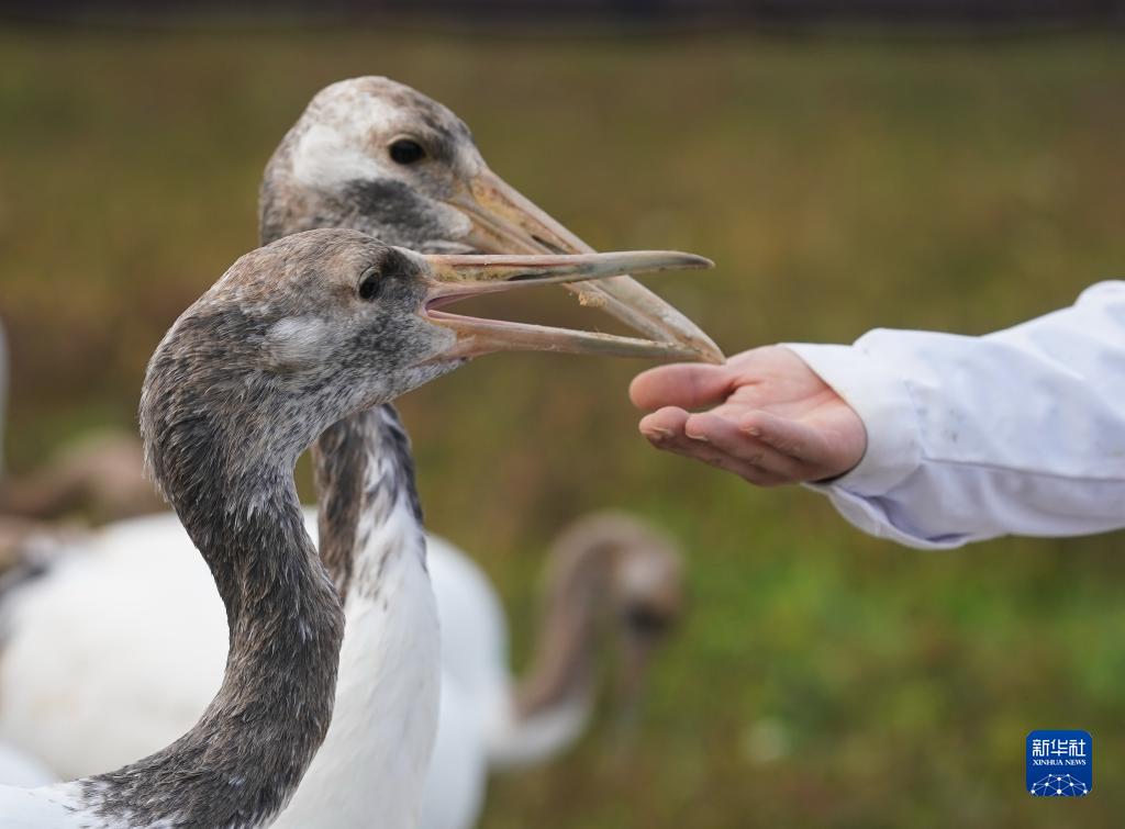 保護區(qū)馴養(yǎng)員與人工繁育的丹頂鶴互動(11月8日攝)。