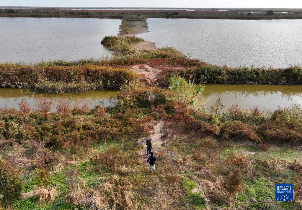 保護(hù)區(qū)科研人員李征浩(下)和趙永強(qiáng)前往目的地,開展鳥類多樣性調(diào)查和監(jiān)測(11月8日攝,無人機(jī)照片)。