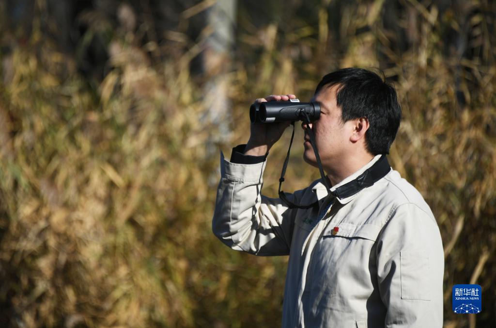 在翠湖國家城市濕地公園,張庚觀察候鳥棲息的情況(2022年11月7日攝)。