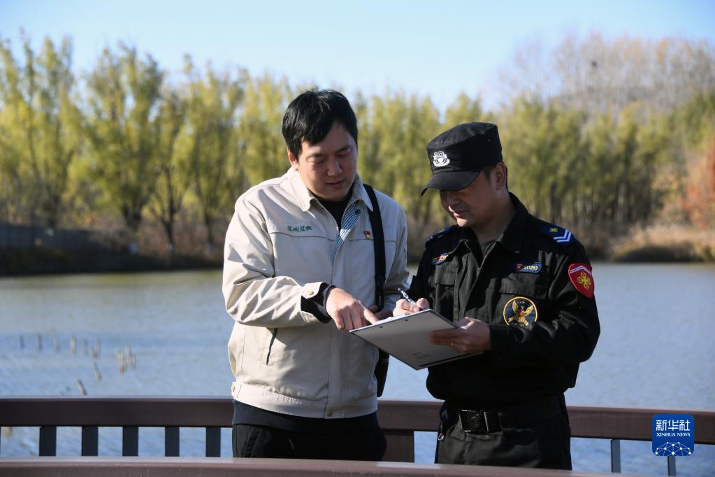 在翠湖國家城市濕地公園,張庚(左)與安保人員一起巡視(2022年11月7日攝)。