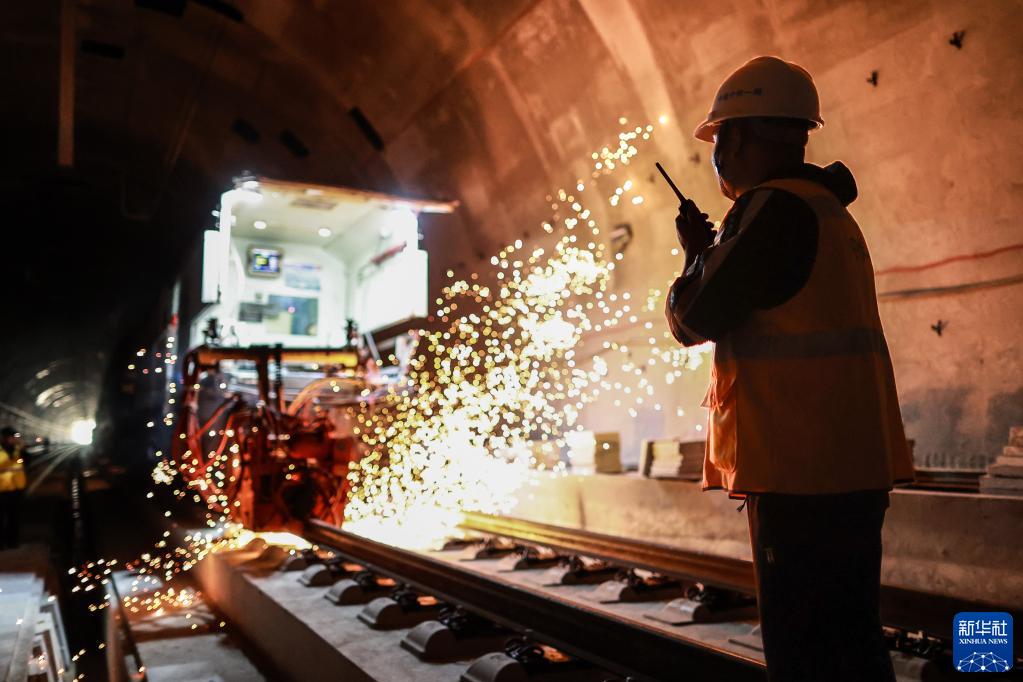 11月11日,中鐵一局員工在貴南高鐵貴州獨山段一條隧道內指揮焊軌機施工。