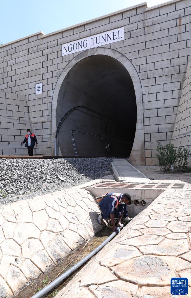 11月10日,一名工作人員在肯尼亞內(nèi)馬鐵路恩貢隧道入口處維護水管。