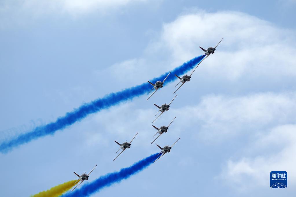 11月11日,空軍航空大學“紅鷹”飛行表演隊在第十四屆中國航展上進行飛行表演。