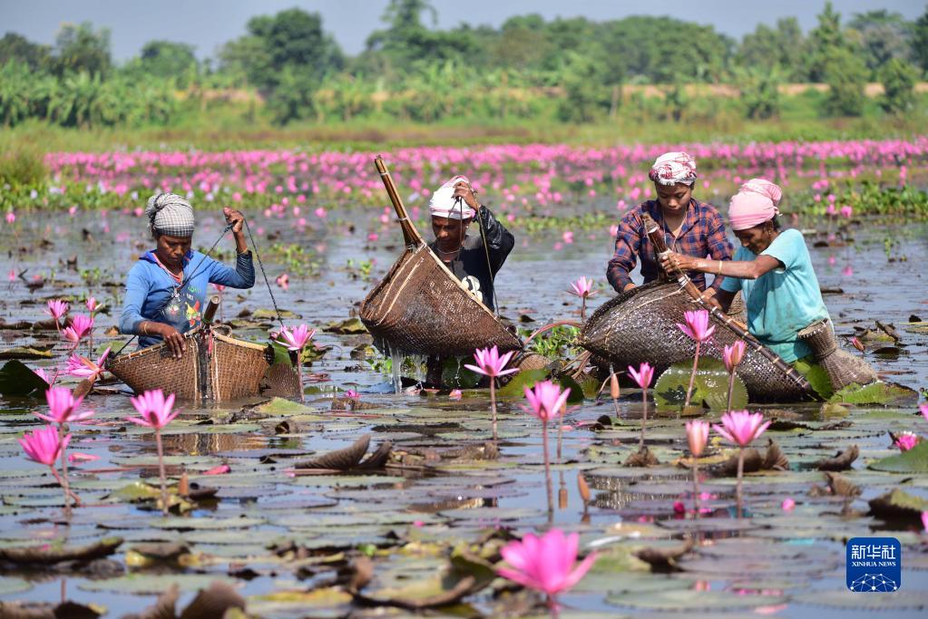 11月6日,幾名女子在印度阿薩姆邦的湖中捕魚。