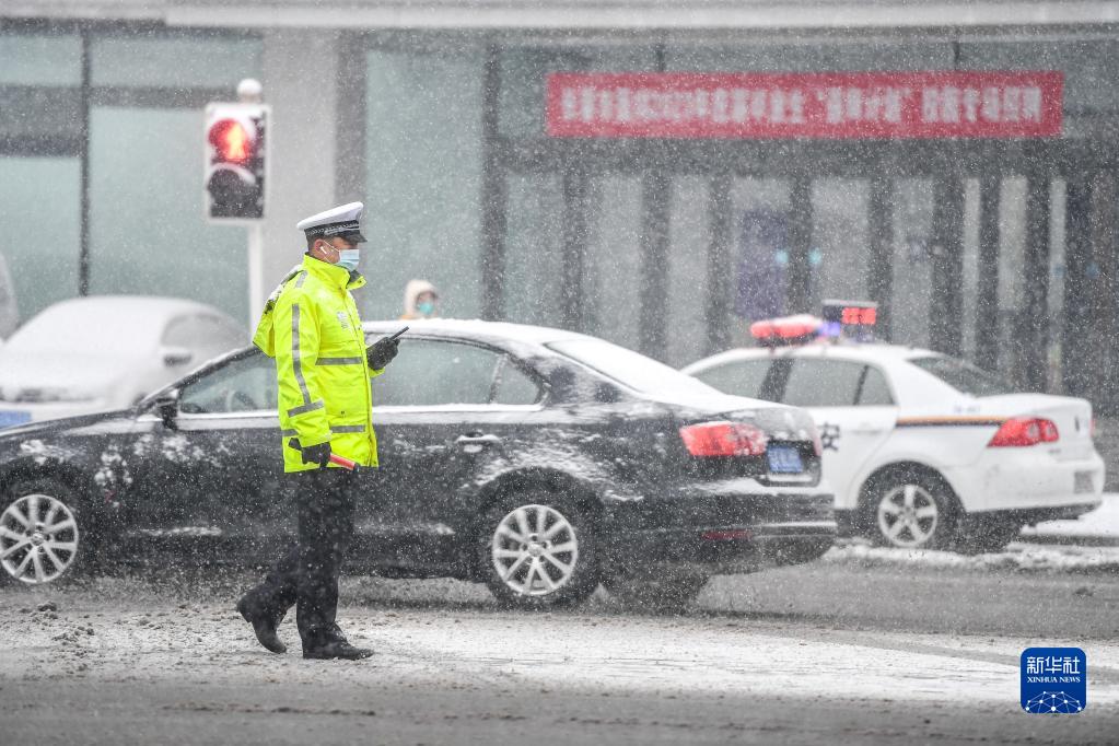 11月12日,交警冒雪在長春市自由大路上執勤。