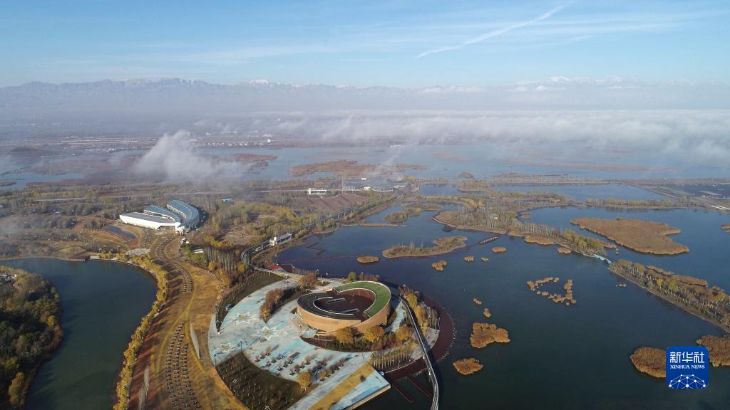 當日,“塞上湖城”寧夏銀川上空出現平流霧景觀,宛若仙境。