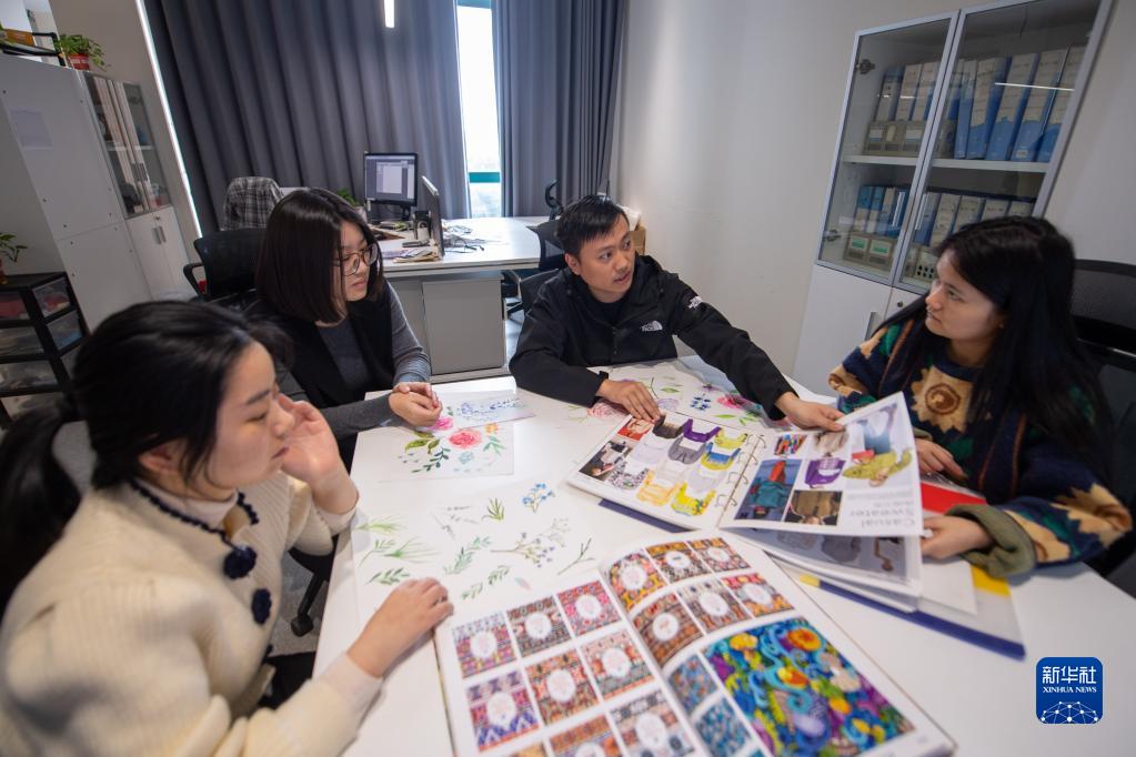 11月2日,在柯橋區(qū)的浙江大樹紡織科技有限公司,研發(fā)部門員工一起討論新印花的設(shè)計(jì)。