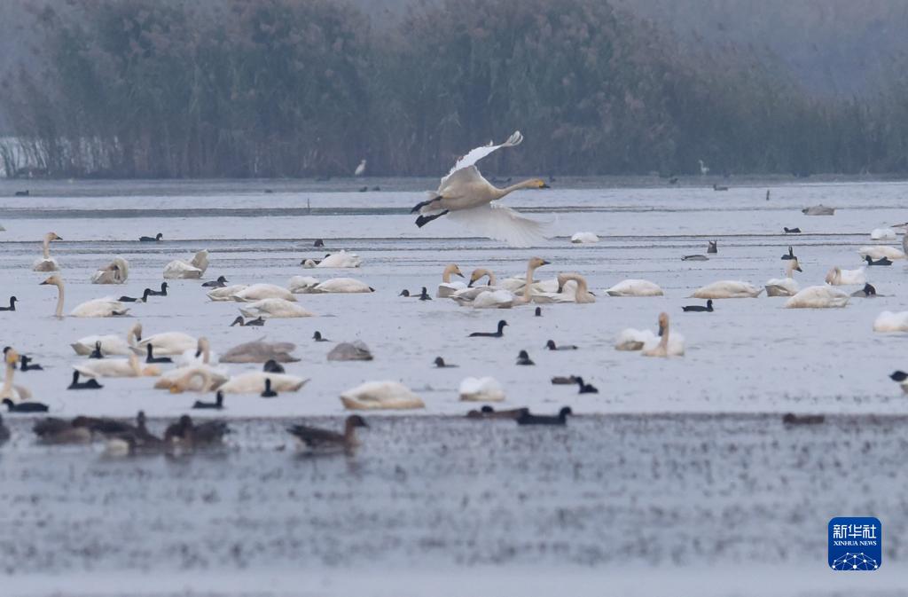 11月11日,天鵝等鳥類在廬江縣黃陂湖棲息。