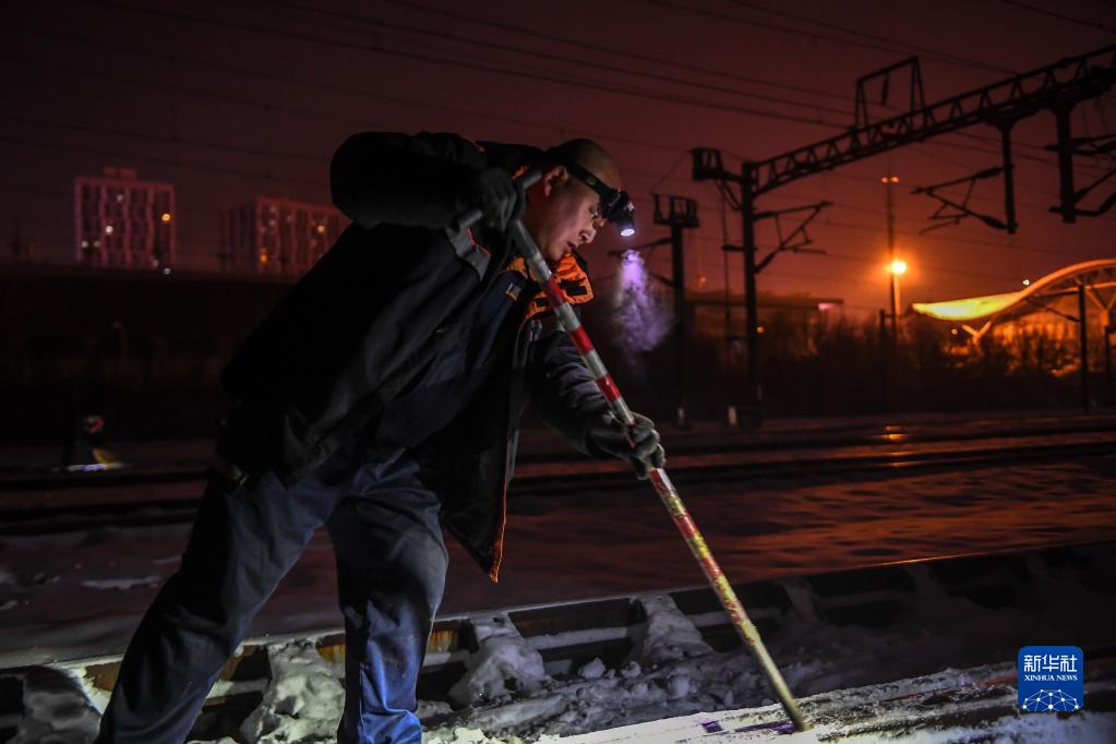 11月13日,在長春火車站,中國鐵路沈陽局集團有限公司長春高鐵基礎設施段工作人員清理鐵軌縫隙內的冰雪。