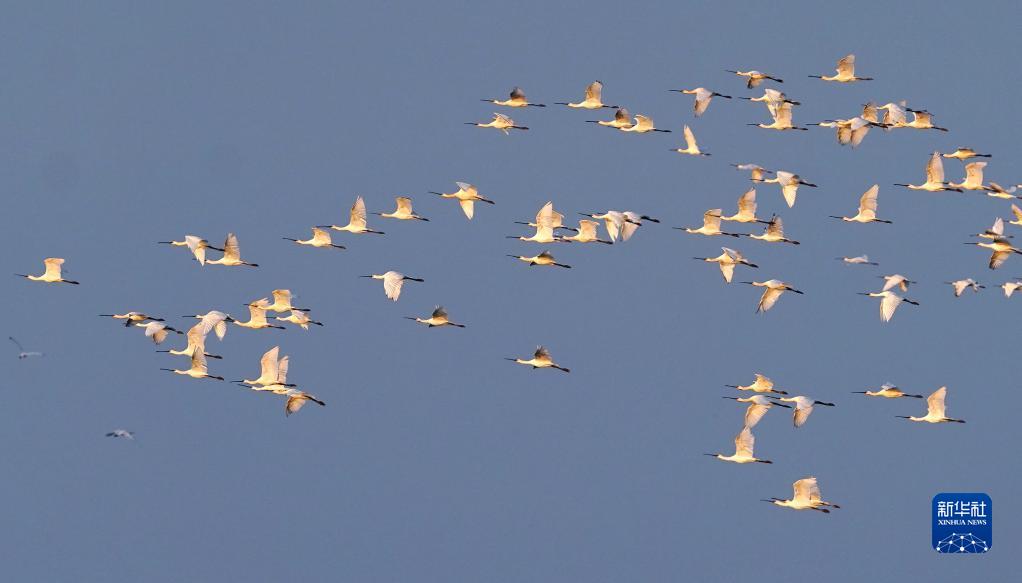 11月11日,一群白琵鷺在江西鄱陽湖南磯濕地國家級自然保護區的濕地上空飛翔。