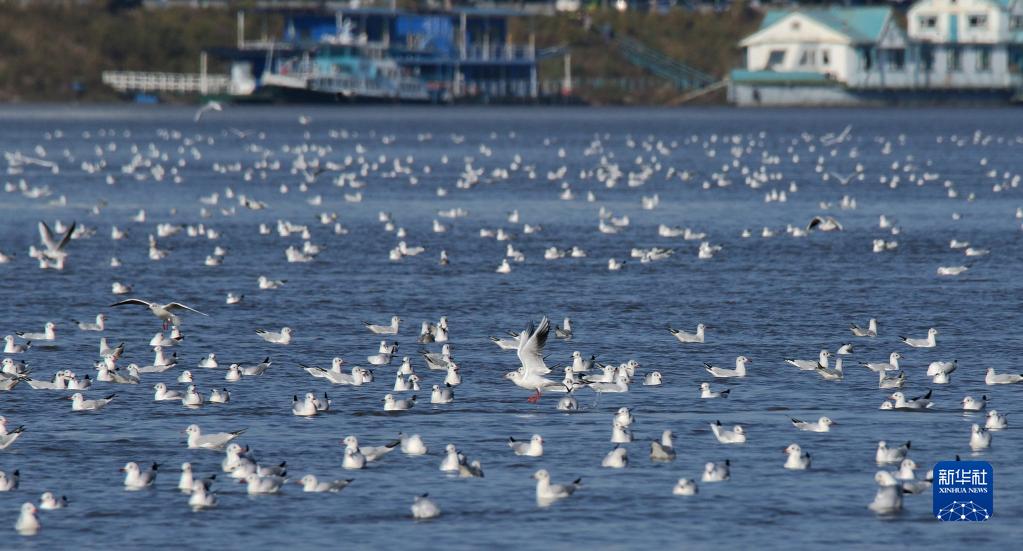 在松花江哈爾濱城區(qū)段,紅嘴鷗在覓食(2021年10月7日攝)。