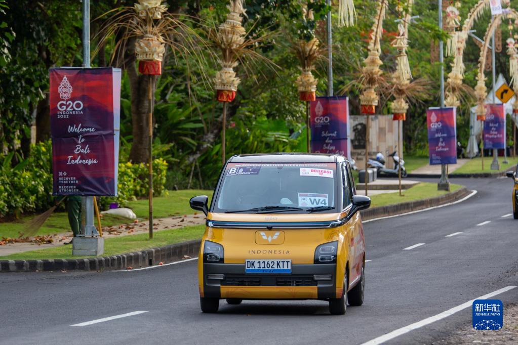 11月12日,峰會用車五菱新能源Air ev行駛在印度尼西亞巴厘島的路上。