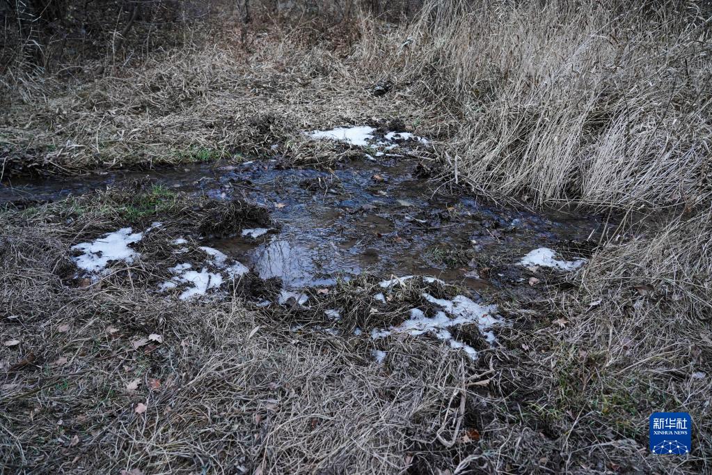 深山里的一段小溪已經開始結冰,水邊的土壤有疑似野生動物的活動痕跡(11月9日攝)。