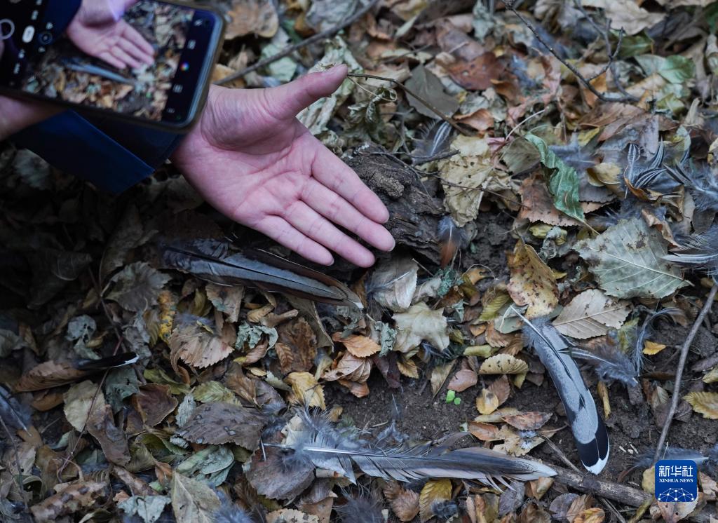 保護(hù)區(qū)工作人員給地上的羽毛拍照,用于辨別物種信息(11月9日攝)。
