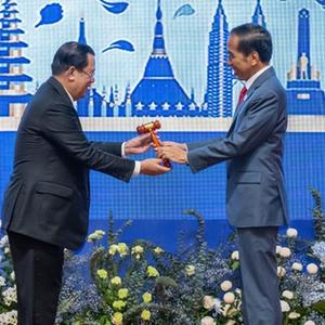 11月13日,在柬埔寨首都金邊,柬埔寨首相洪森(左)將東盟輪值主席木槌移交給2023年東盟輪值主席國印度尼西亞總統佐科。