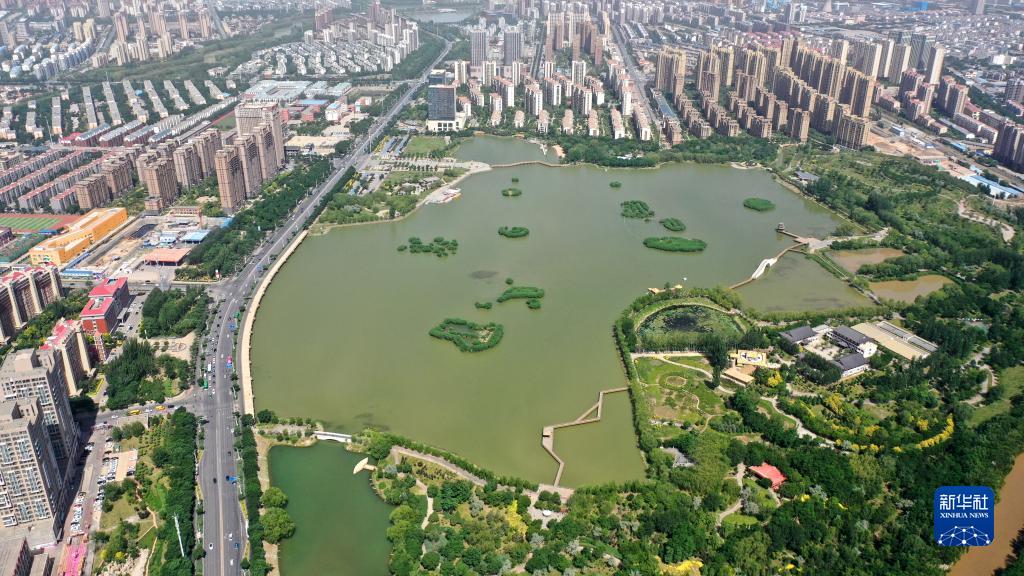 寧夏銀川市寶湖國(guó)家城市濕地公園(2021年6月7日攝,無(wú)人機(jī)照片)。