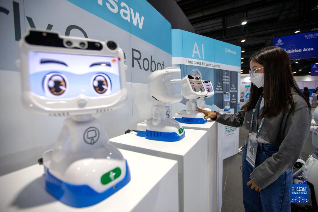 11月14日,在泰國首都曼谷,工作人員在APEC會(huì)議媒體中心與機(jī)器人互動(dòng)。
