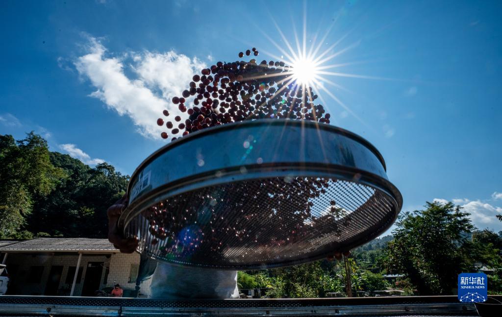 11月16日,在云南省普洱市野鴨塘河谷咖啡莊園,農民在晾曬咖啡果。