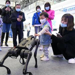 11月16日,在第十屆中國(綿陽)科技城國際科技博覽會上,小朋友與仿生智能四足機器狗互動。